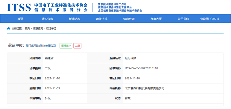 兆翔科技于2018年启动ITSS建设及资质申报工作,开展标准学习与研究,分析公司当前服务体系与ITSS标准的差异,经过改进实施及评估总结,兆翔科技完成了公司内部的ITSS体系建设,并于2020年顺利通过ITSS三级资质认证。